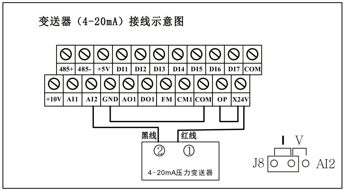 4-20mA變送器反饋模式,需要把綠色端子上的GND和COM用導(dǎo)線短接,變送器的正端接X24V(或者和X24V短接的OP),信號(hào)線接AI2。如下圖所示。